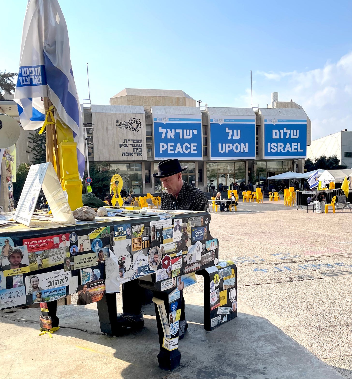 The location of the photo, the plaza in front of Beit Ariella, a great library, is so appropriate.